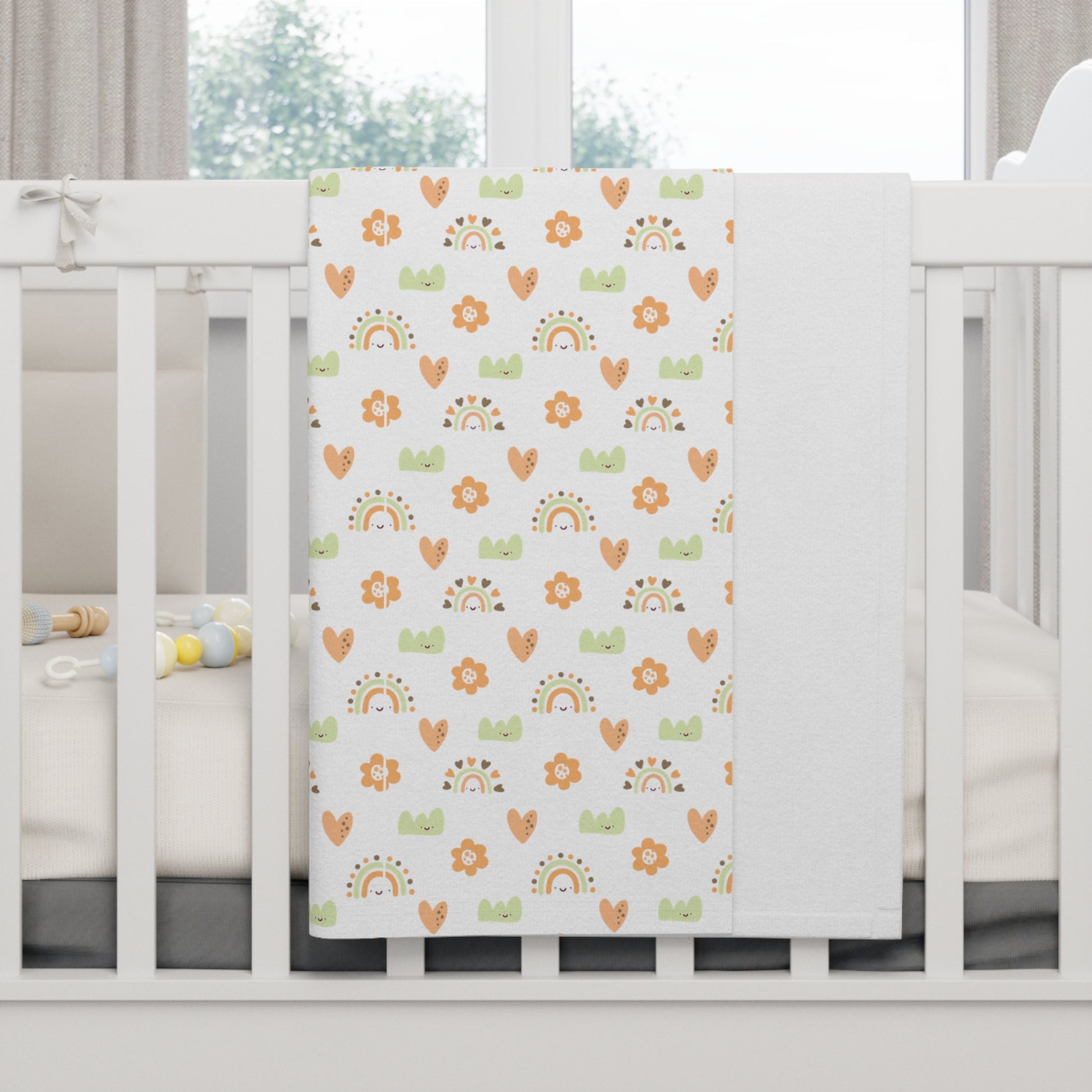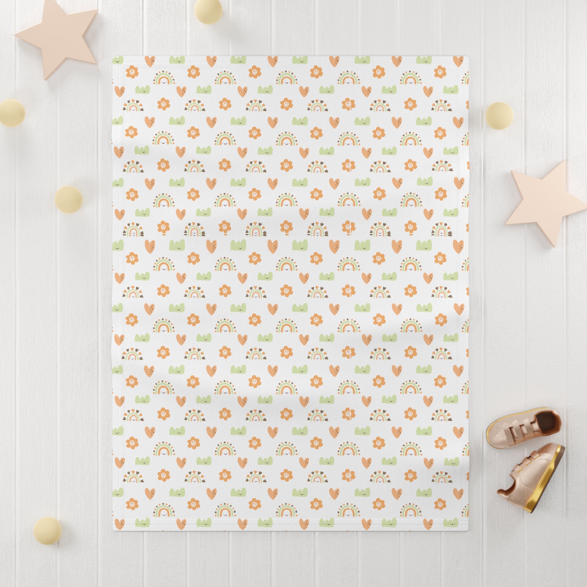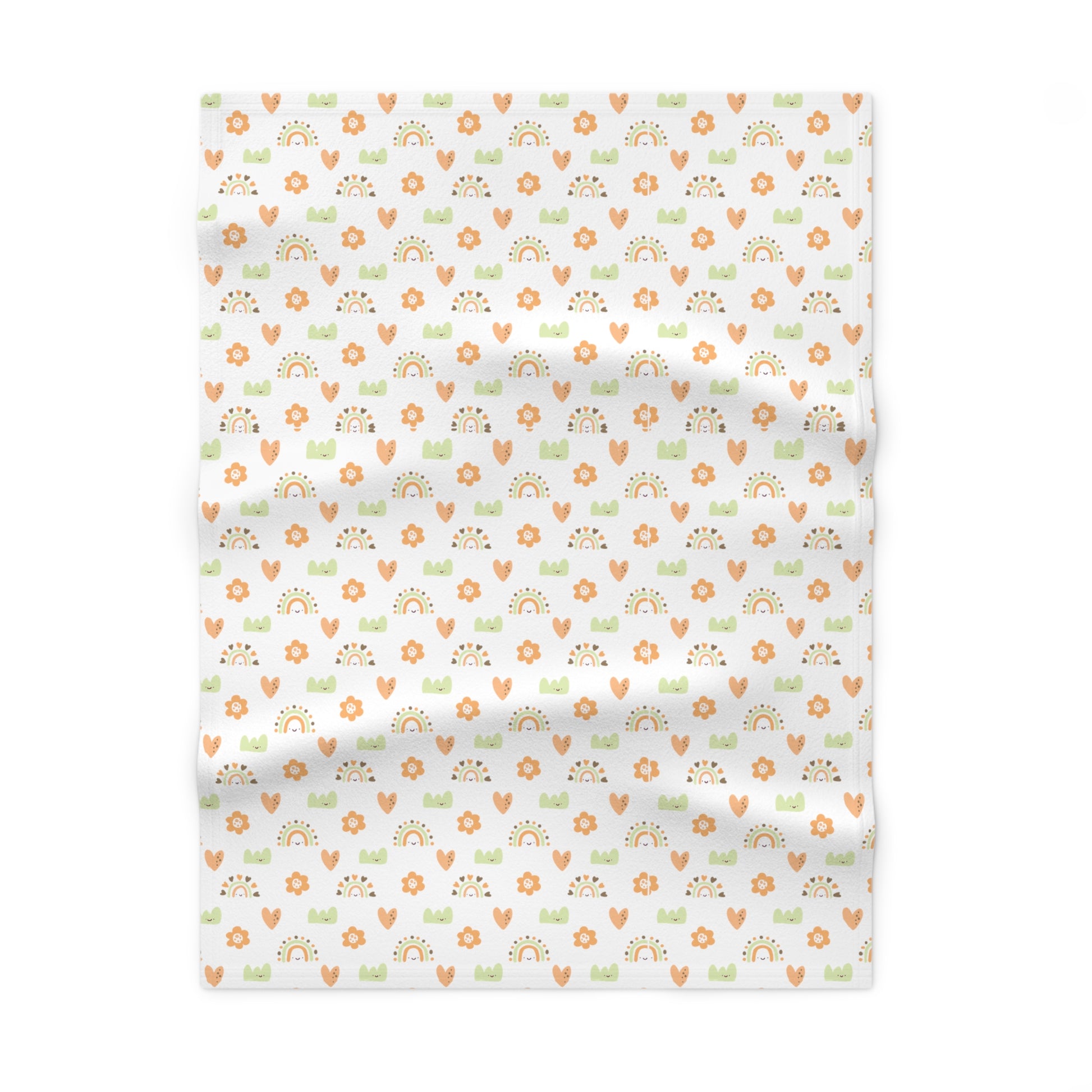Cute and Cuddly Green Orange Brown Happy Hearts Rainbows Flowers Soft Fleece Baby Blanket
